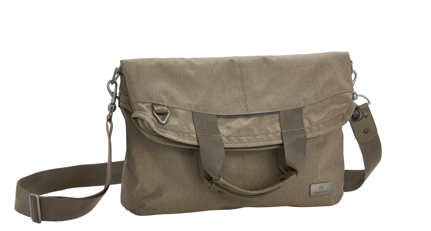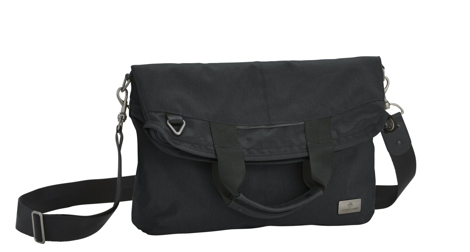 The latest in versatility. This tablet-compatible shoulder bag unfolds extending its silhouette to a vertical tote shape for a 15″ laptop carry. Tote carry offers 125% more capacity capacity.